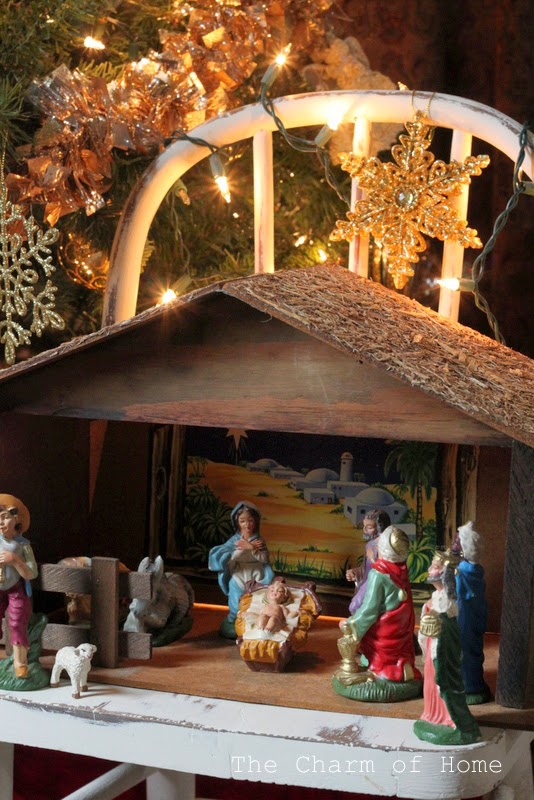 She asked if I would create a vignette and tell a story and the first thing that came to me was to share this manger scene.  This was the manger scene of my childhood.  I happened to inherit it last Christmas.