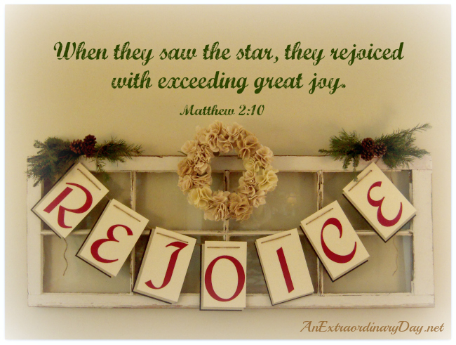 As I began decorating my home for Christmas I started adding the word ‘joy’ to my wreaths and packages. For some time I’ve been smitten with banners and decided to make one for Christmas. Rejoice seemed to be the perfect word for my banner which I constructed and hung on an old window.